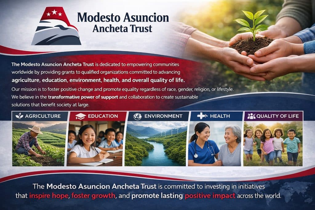 The Modesto Asuncion Ancheta Trust is dedicated to empowering communities worldwide by providing strategic grants to organizations committed to advancing agriculture, education, environment, health, and overall quality of life. We strive to inspire positive change, foster equality, and create sustainable solutions through support, collaboration, and strategic partnerships, ultimately uplifting underserved communities and promoting global well-being.